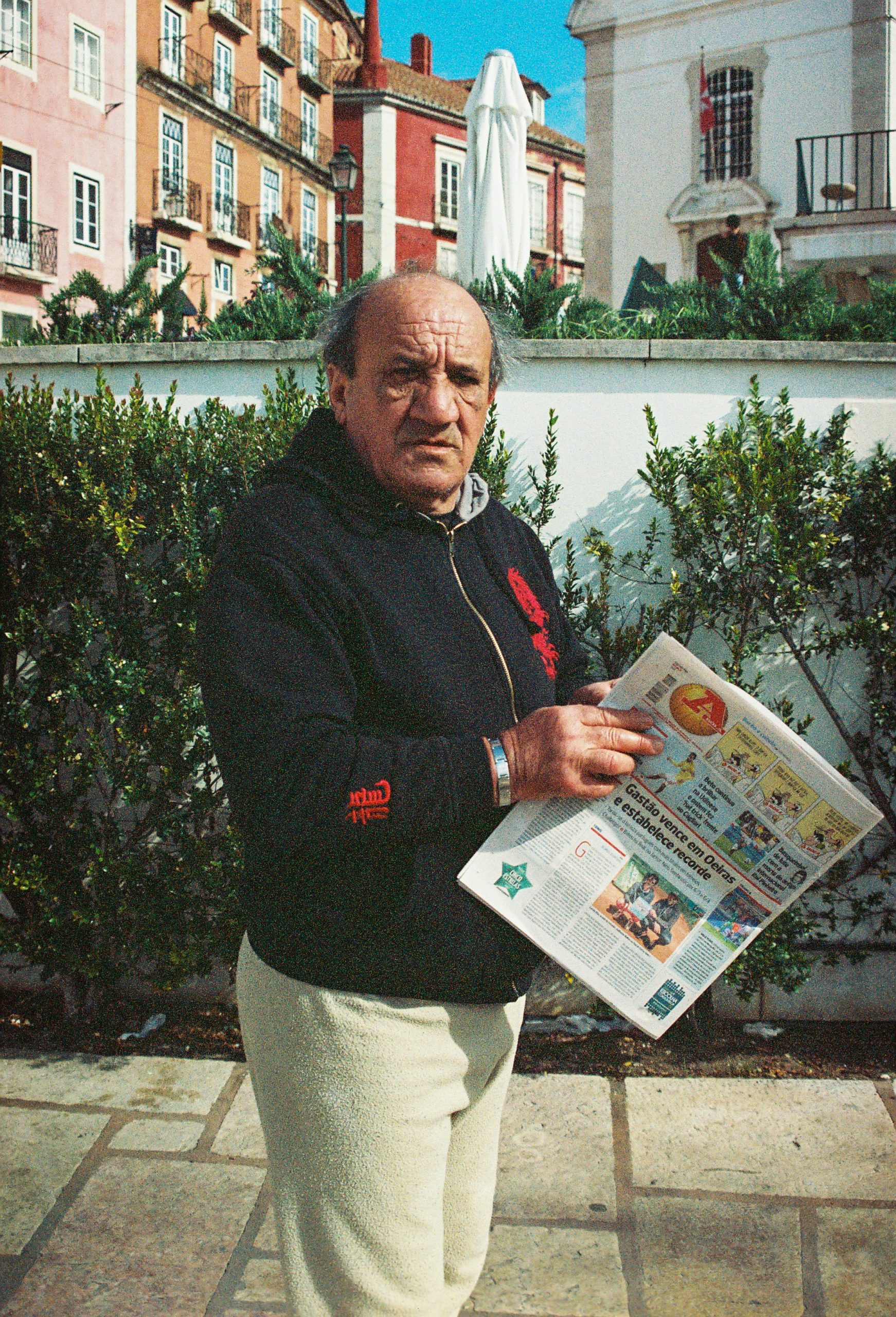 Vítor fue el primer retrato que hice en el barrio, frente a los azulejos con navíos. Simplemente le pregunté su nombre, edad y si podía hacerle una foto. Accedió y, después, continuó leyendo su diario mientras caminaba hacia un banco para sentarse.